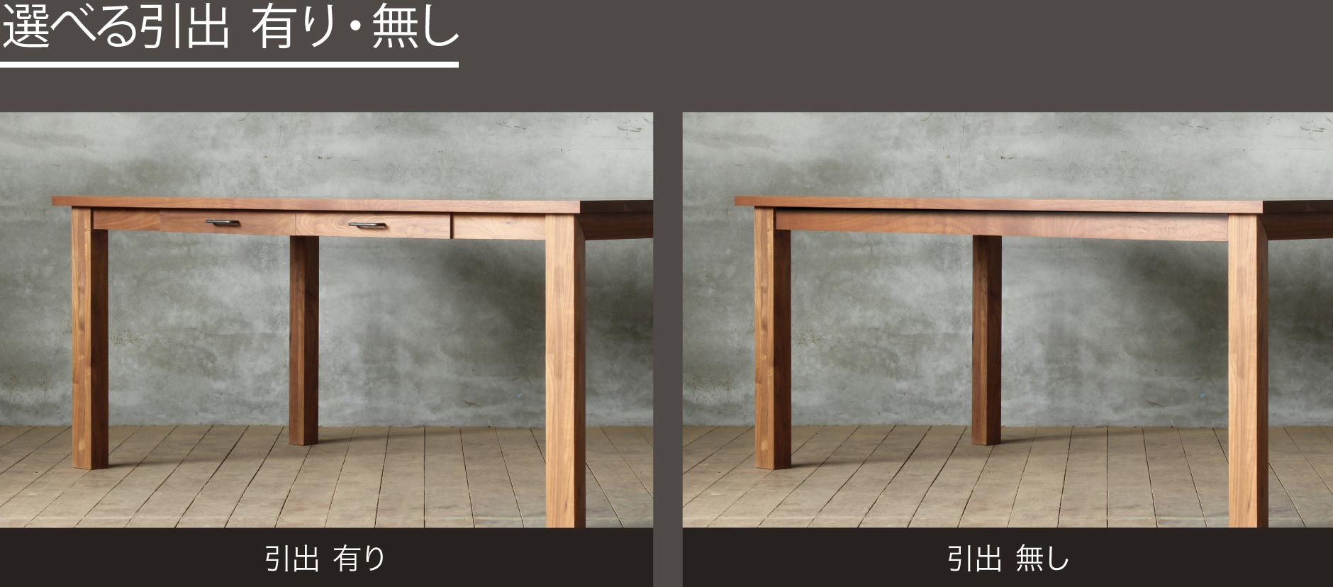 アクセントとしてもかっこよく、ちょっとした収納にも便利な引出。お客様のライフスタイルやお部屋の雰囲気に合わせて引出の有無をお選びいただけます。なお、引出のサイズや数はテーブルのサイズに合わせて作成しておりますので、お選びいただけません。ご了承くださいませ。